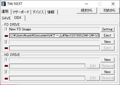 起動すると写真のようなのが開くと思います。FD DRIVE 1のあたりをクリックするとファイル選択になるので、イメージ化したFDデータを読ませます。