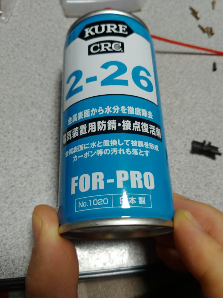 SWのところのプラスチックを外すと、直にSWが見えますのでそこに接点復活剤を吹き付けてください。今回は、CRC2-26を使いました。