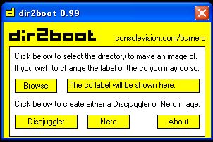 Browseをおして Dreamcast SD Rip ver1.1 のフォルダを選択します。Discjugglerを選択すれば Dir2boot.exe本体のフォルダに Dcsdrip11.cdi が出来あがります。