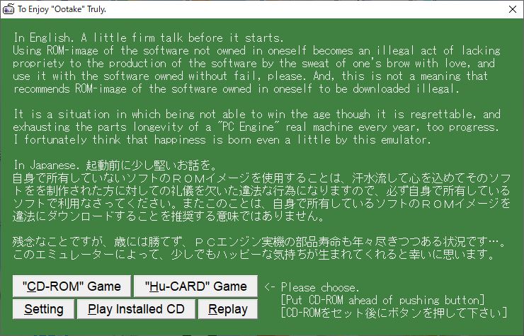 個人的にPCエンジンエミュは「Ootake」をずっと使ってます。CD-ROMもHuカードも問題なく動くし更新も頻繁に行われています。