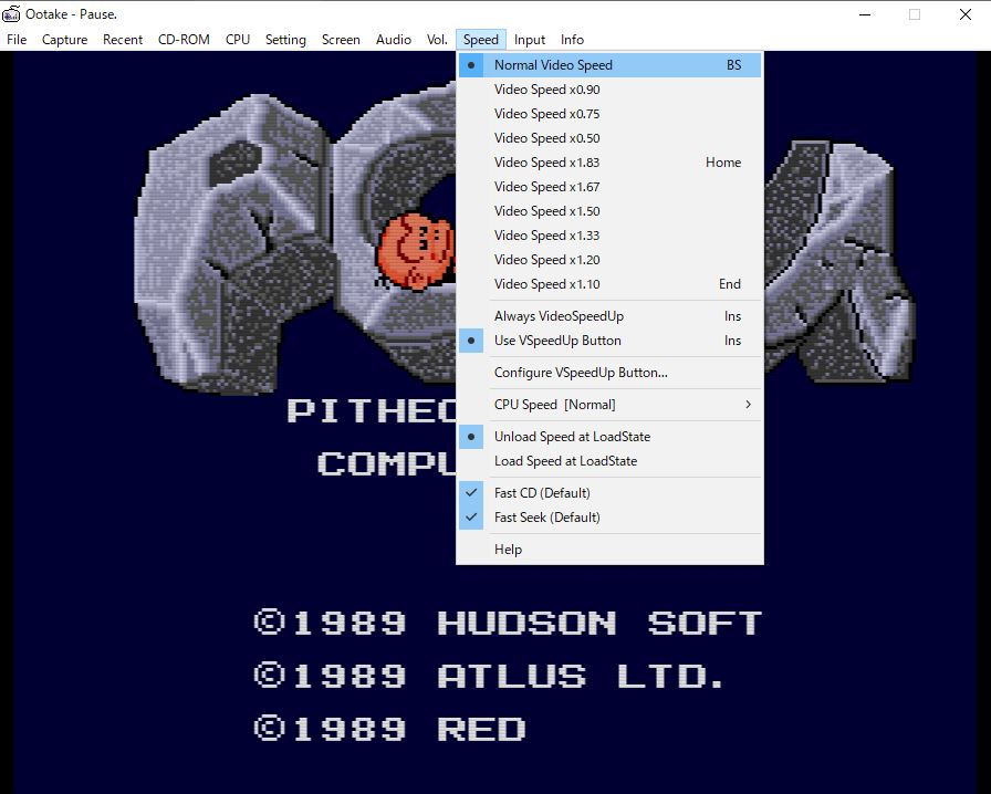 一時的にゲームの実行速度を上げたり下げたりできる速度調節機能があります。まず、メニューバーの「Speed」から「Configure VSpeedUp Button」を選択して、「早送りキー」を設定します。