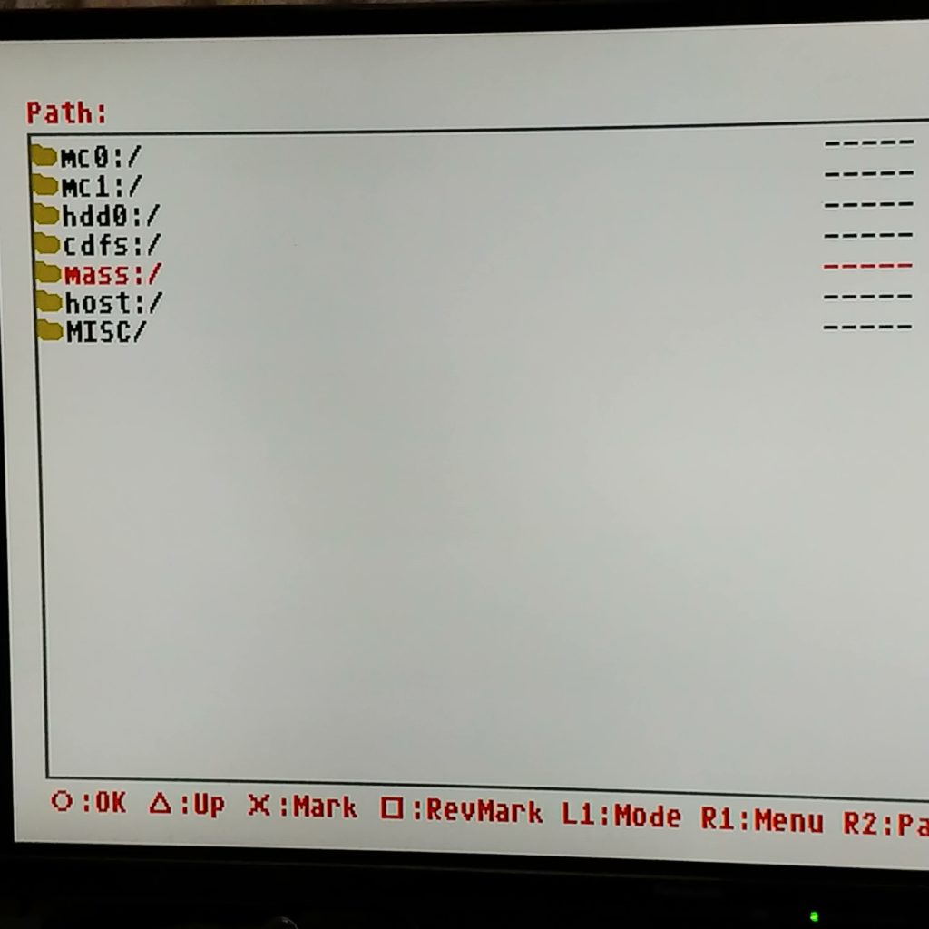 USBメモリが、実は入手が厳しかったりします。今どきの大容量のUSBメモリではPS2は読み込むことができません。512MBくらいの少ない容量のものが必要です。今回は、64MBの手持ちUSBメモリを使用しました。