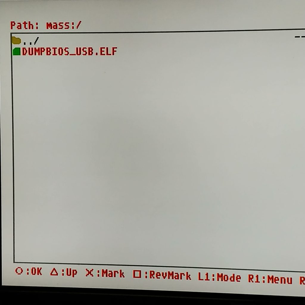 8.「DUMPBIOS_USB.ELF」を実行します。画面が消えるので、10分くらい待ってください。時間がたったら、PS2の電源を落としてUSBメモリの中を確認します。USBメモリの中にBIOSが保存されていると思います。