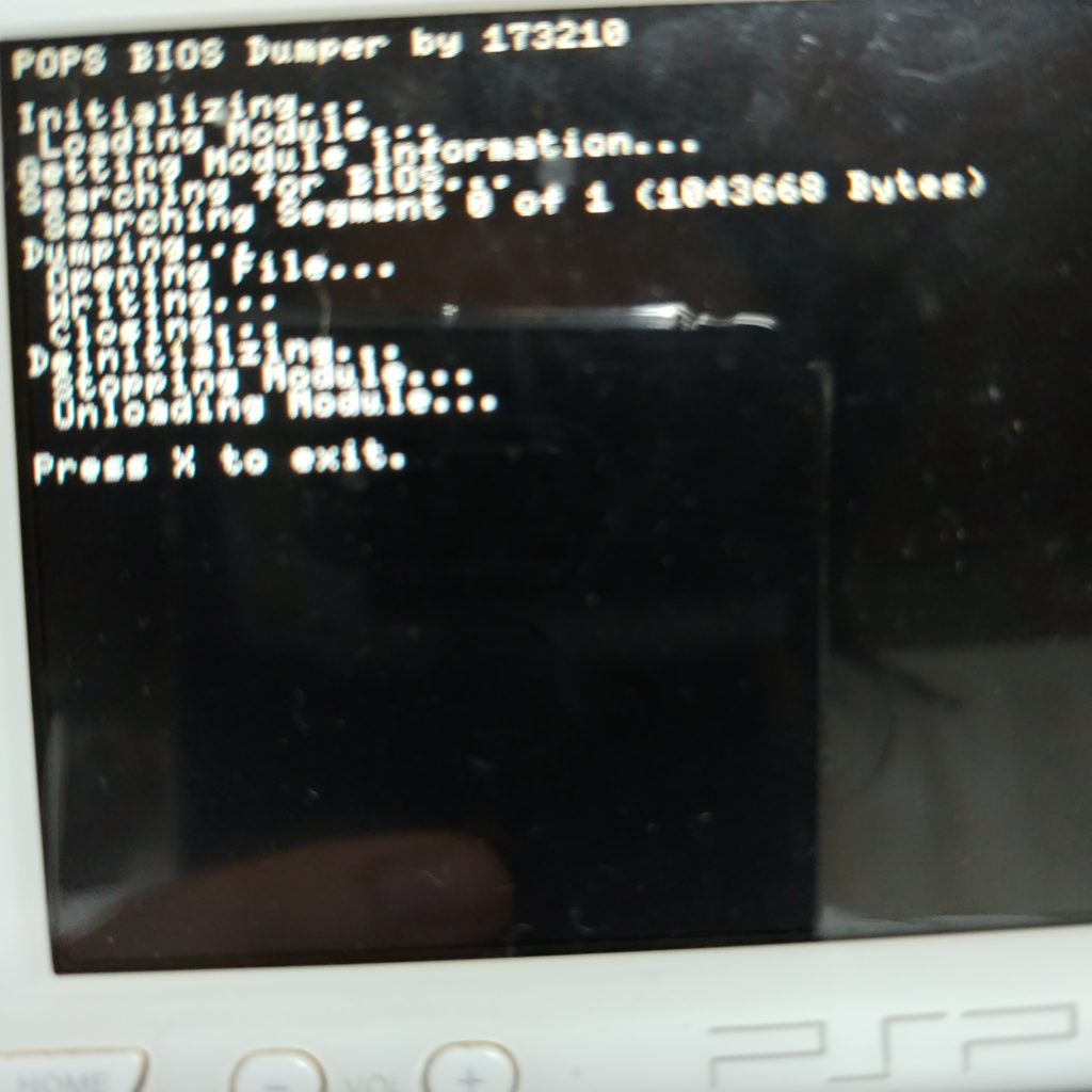 メッセージがでたら、”X”ボタンを押してBIOSを吸い出します。再びPCとPSPを接続してください。「PSX-BIOS.ROM」というファイルが出来ていれば成功です。