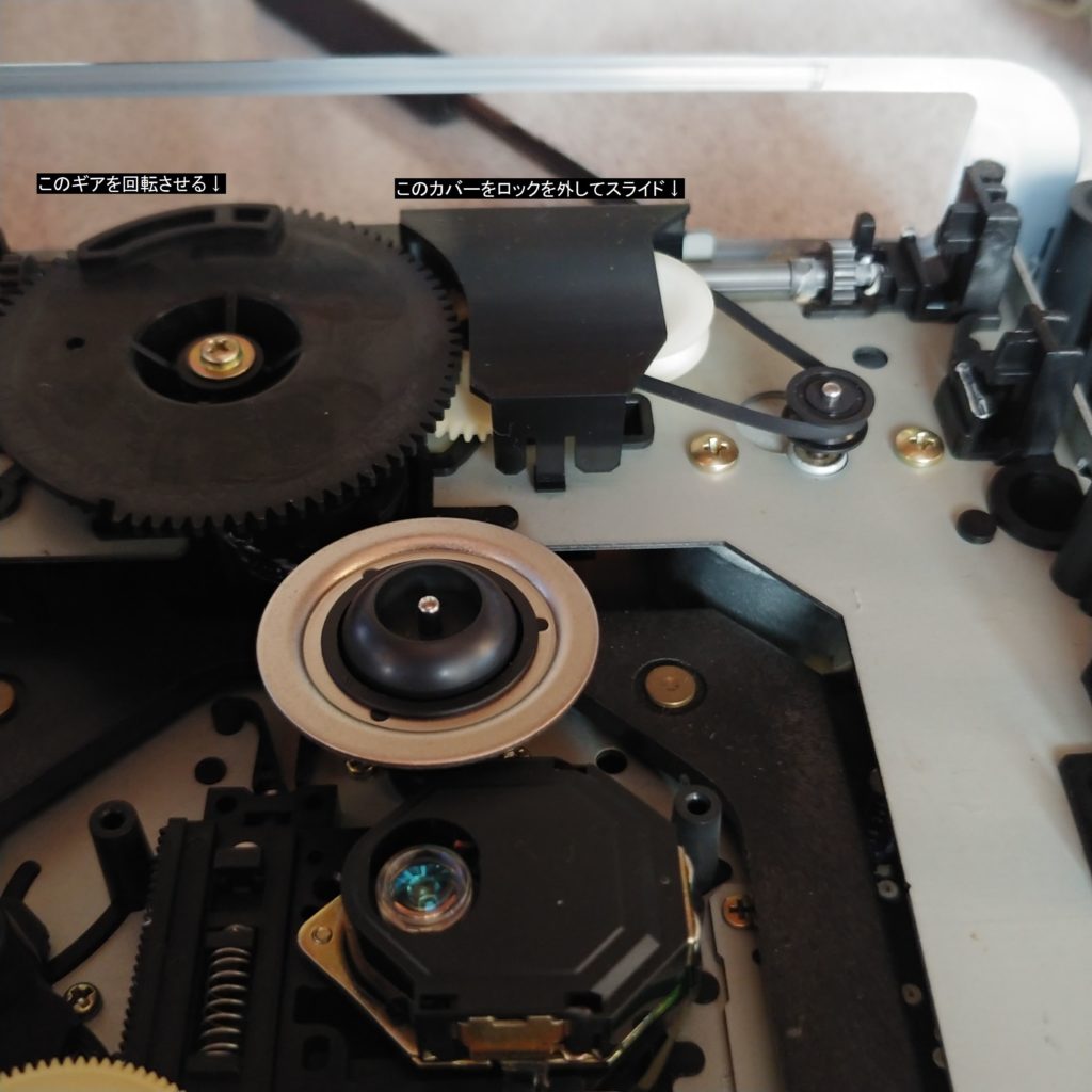 ここにピンがついているので、ロックを外しながら上に引き抜きます。引き抜いたら、CDの中心が乗る場所(スピンドルモータ)の近くの黒いギアを右回転で回します。CDトレイが出てくるので最大まででたところで、左右にあるロックをピンセットなどで広げながら、トレイを引き抜いてください。
