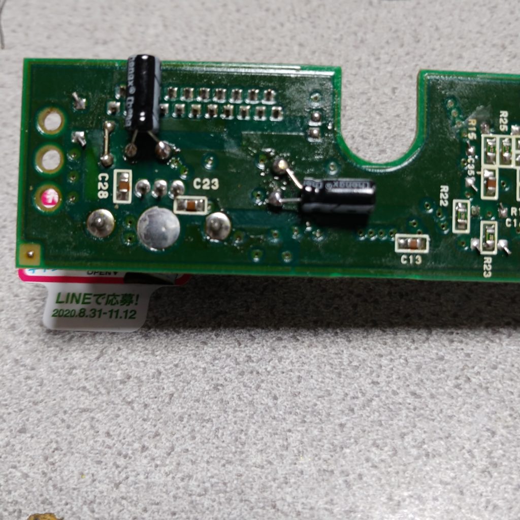 電源基板の電解コンデンサは足つきのものなので、はんだ吸い取り機がないと厳しいので道具がない場合は割り切ってスルーホールに直接はんだ付けしてください。