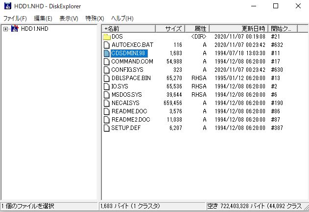 手順4は、手順3で展開したフォルダに、「CDSDMINI.98」というファイルがあります。DiskExplorer」を使ってT98-NEXTのHDDイメージに「CDSDMINI.98」をコピーします。