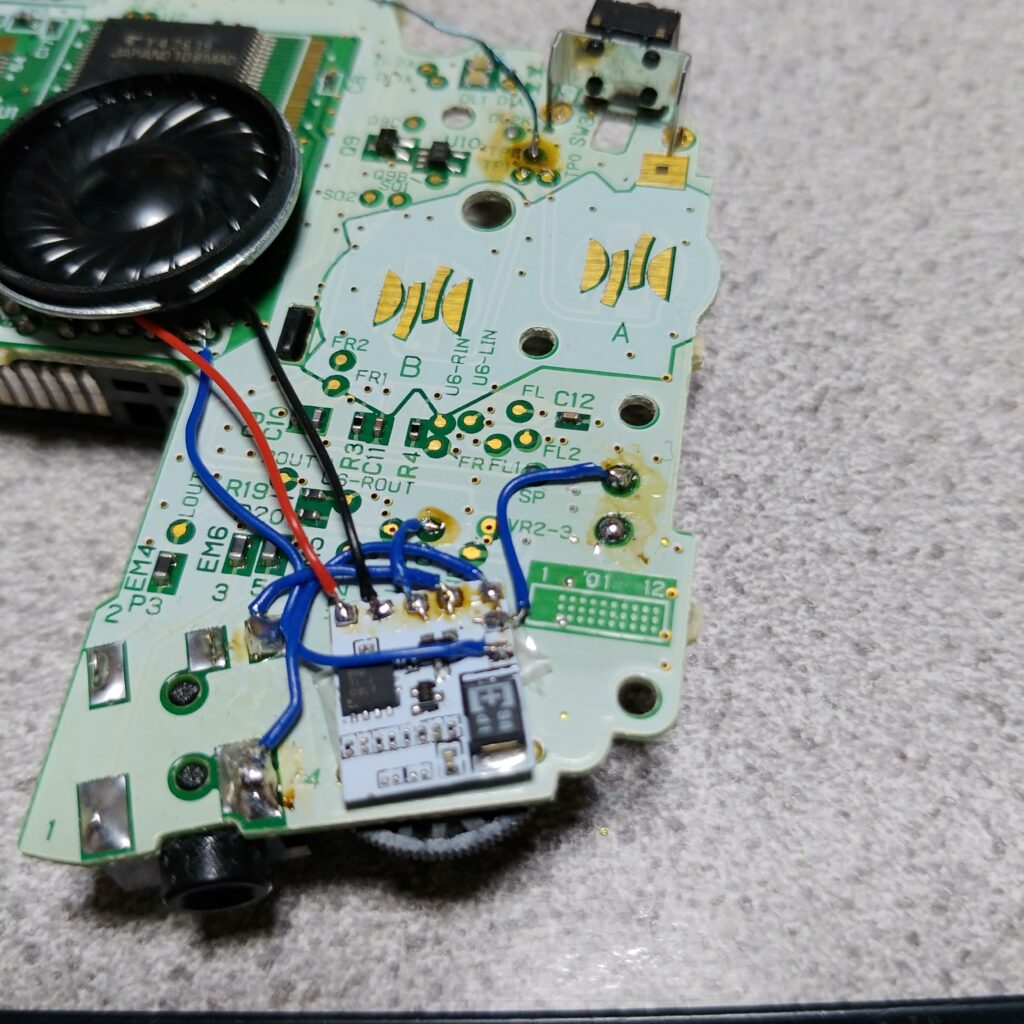 純正のスピーカを外して、付属の子基板を貼り付けてはんだ付けしました。ワイヤーはAWG30の細いものを使用しています。細いワイヤーじゃないと厳しいと思いいます。