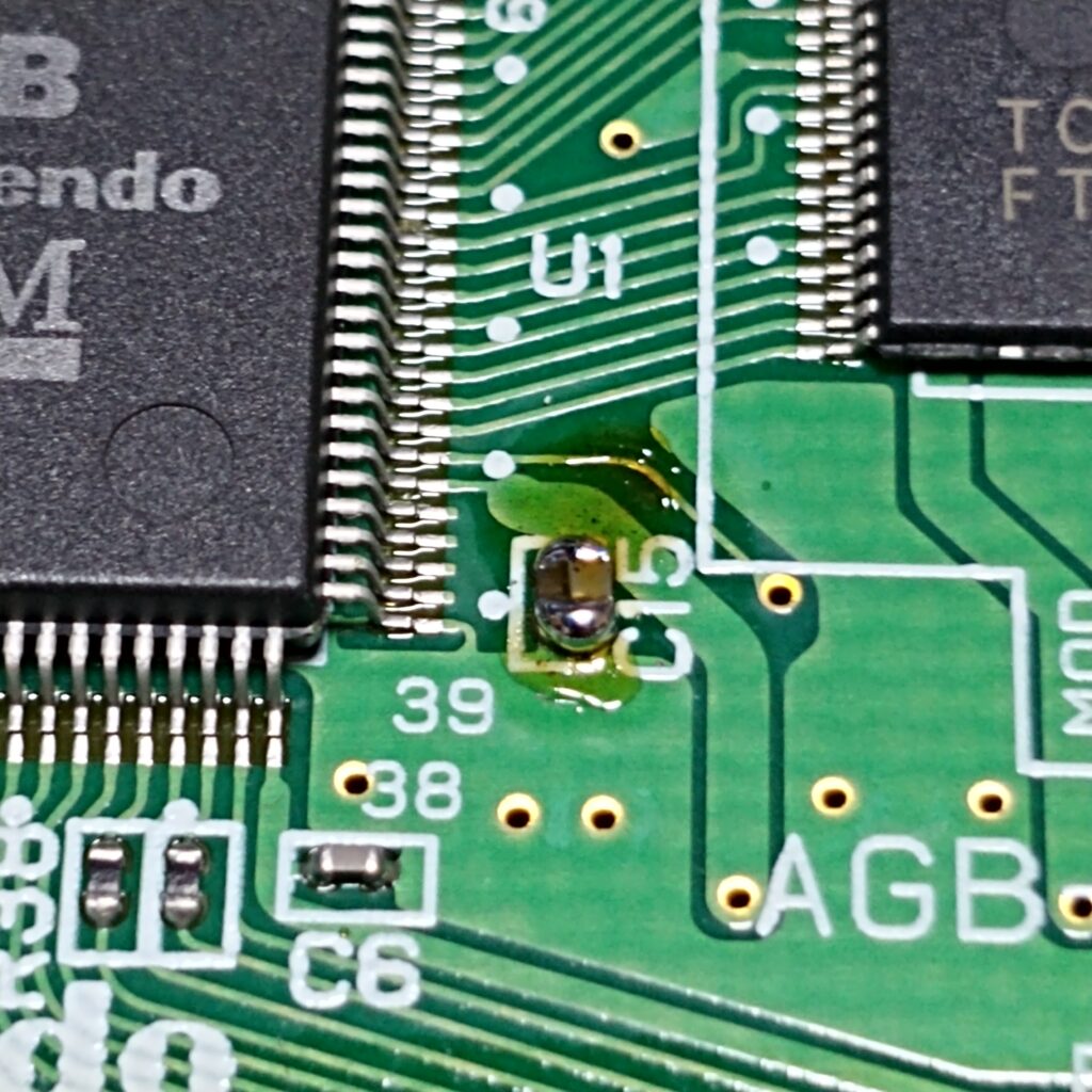 CPUの近くにC15とありますので、ここにコンデンサーをつけます。拡大して写真撮ってますが、実際はかなり小さいので虫眼鏡で確認しながらつけました。