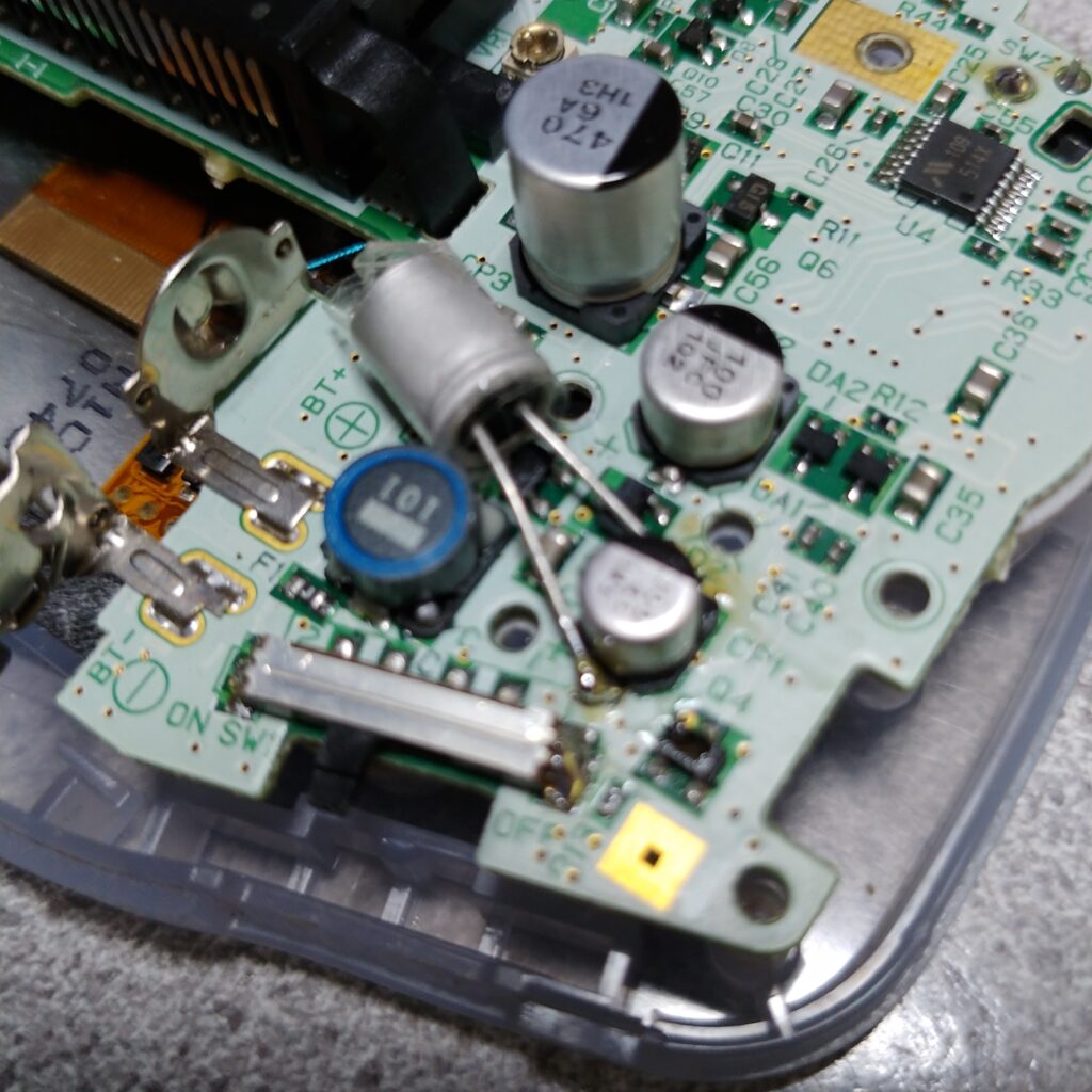 電源SWの上の辺りにある、電解コンデンサーに追加で電解コンデンサーをつけました。電解コンデンサーには絶縁のためにテープを巻いています。
