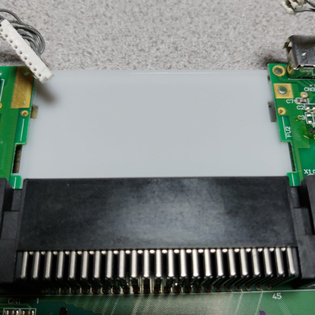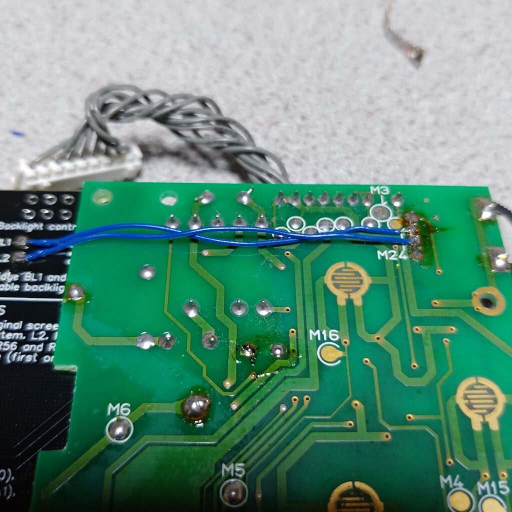 純正の画面を慎重に外して、上の基板をはんだ付けします。この基板がなかなか導通とれなくて結構時間かかりました。フラックス塗ったりフラックス除去剤を何度かやってついた感じです。