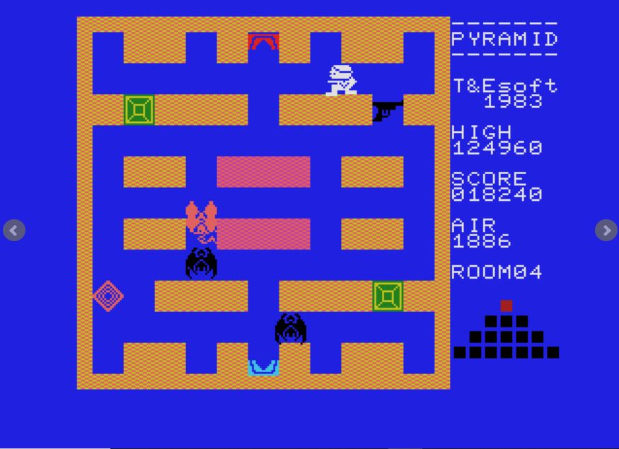 本作は1983年にリリースされたアクションゲーム。プレイヤーは冒険者を操作してピラミッドを探索し、宝探しの冒険をすることになります。各部屋にはサソリやコウモリが徘徊しているので、通路を上手く使ったり、一対のワープトンネルなどを駆使したり、宝箱に隠れたりして、やり過ごしましょう。敵に接触すると冒険者をひとり失い、すべての冒険者が倒れるとゲームオーバーとなります。