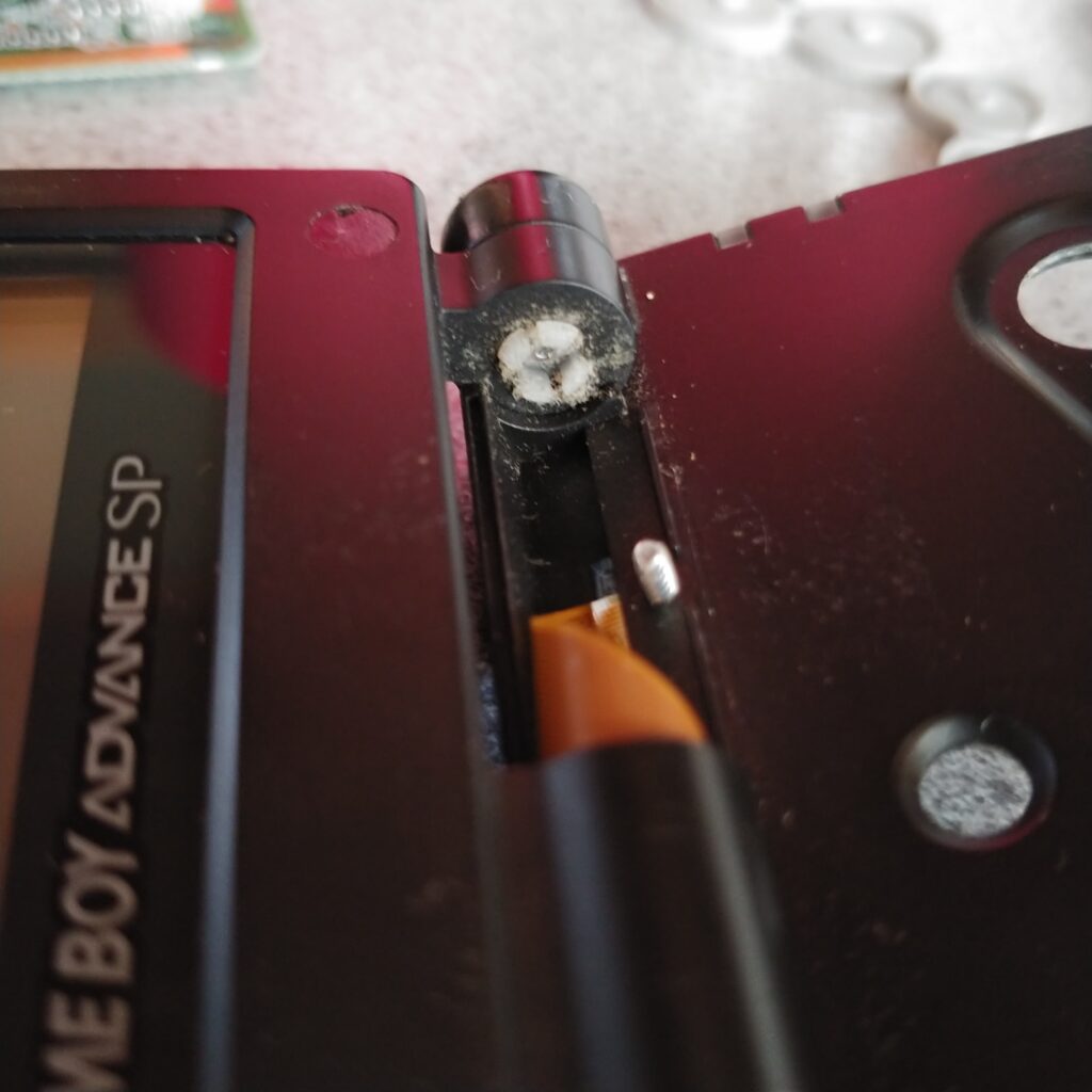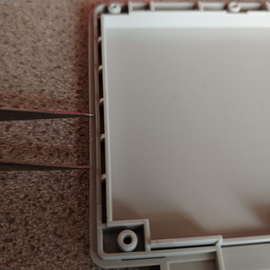 RETROSIXの部品はヒンジの先端の部分を交換する部品がついています。こちらを交換すればよかったんですが、気付かなかったので、純正の黒のまま組み上げました。RETROSIXのシェルはIPS液晶対応しているものと思っていましたが、ピンセットの先端部部をカットしないと蓋がしまりません。シェルの左側の部分になります。
