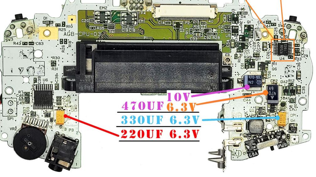 海外のサイトでは、ゲームボーイアドバンスの電解コンデンサをタンタルコンデンサに変更しているものがあります。古いゲーム機なので、容量が抜けるかもしれない電解コンデンサの変更は有効な改造だと思います。