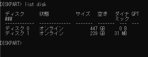 - 次に、「list disk」と入力して、「enter」を押してディスクをリストアップします。GPTに変換する対象のディスク番号を確認します。